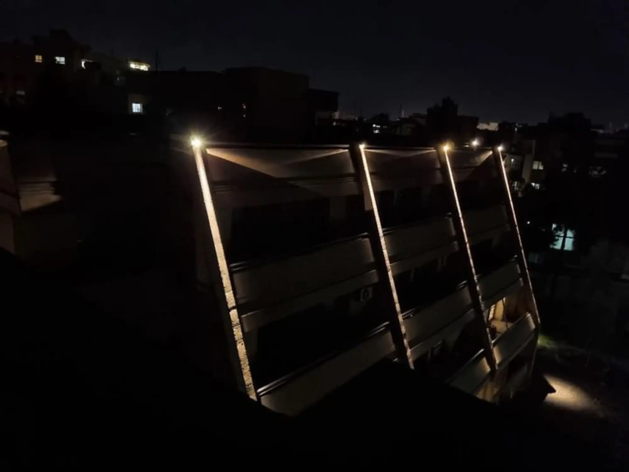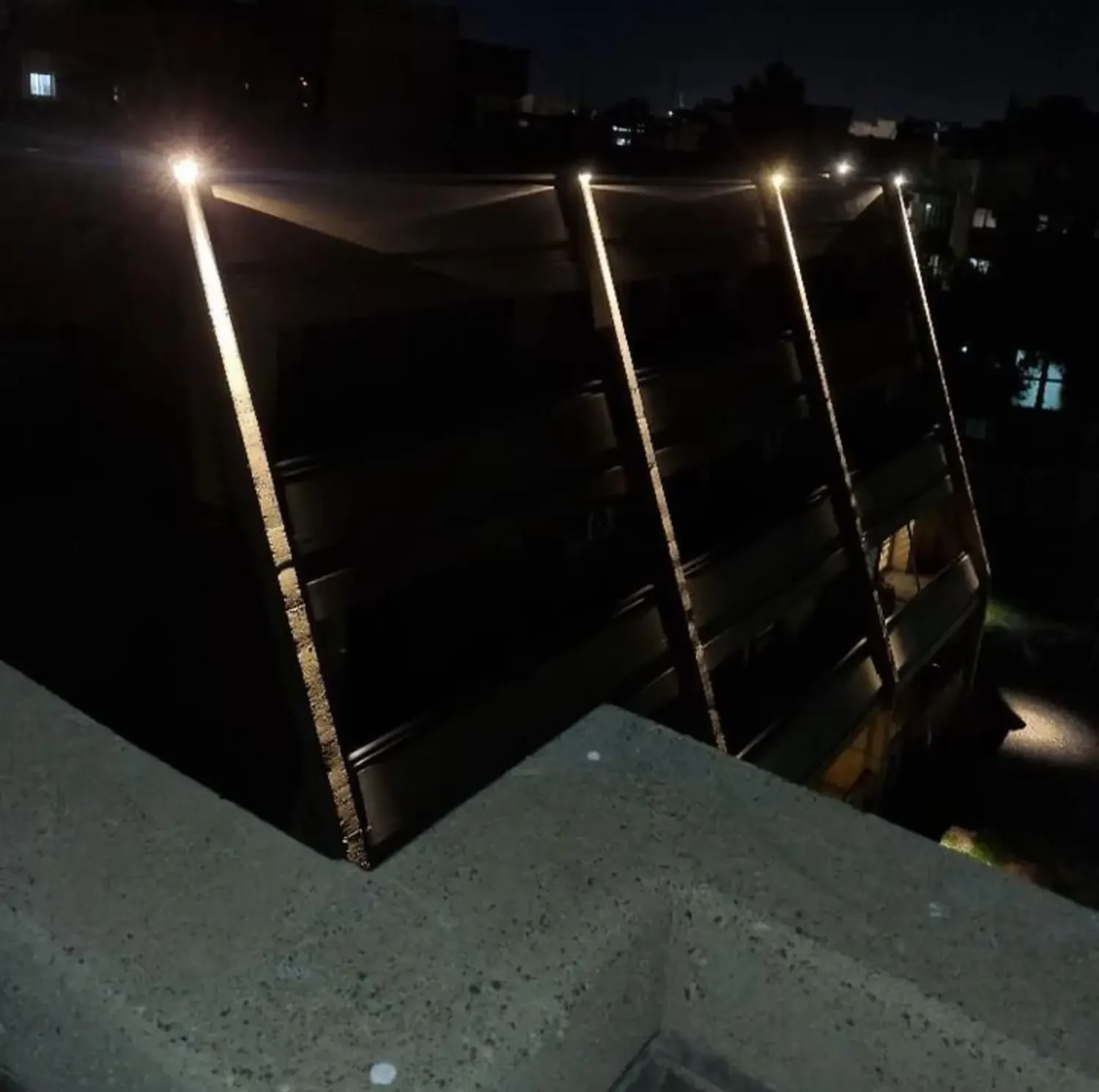 در این پروژه، نورهای لاینر در مرزهای عمودی نما نصب شدهاند تا خطوط معماری ساختمان در شب نمایانتر شوند.